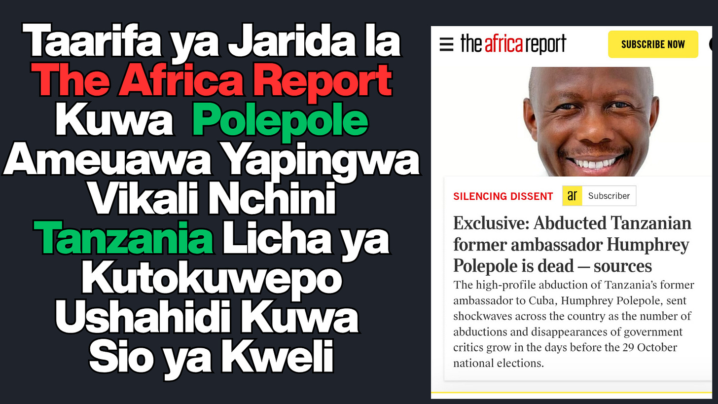 Ripoti maalum ya The Africa Report ya Oktoba 11, 2025, inayodai kuwa Balozi wa zamani wa Tanzania Humphrey Polepole alifariki muda mfupi baada ya kutekwa kwake Oktoba 6, 2025, kutokana na majeraha makali aliyopata kwenye shambulio hilo, imezua mashaka mengi na shutuma nchini Tanzania. Hii inaonyesha mgawanyiko wa kusikitisha kati ya hasira za watu na hatua halisi zinazochukuliwa. Licha ya The Africa Report kuwa moja ya vyombo vya habari vya kimataifa vinavyoheshimika zaidi barani Afrika, Watanzania wengi wameikataa ripoti hiyo—si kwa sababu ya ushahidi wowote wa kupinga au hadithi nyingine tofauti, bali kwa kudai kuwa jarida hilo linashirikiana na serikali kudhoofisha mwamko wa wananchi kujiunga na maandamano yaliyopangwa kufanyika Oktoba 29, 2025.