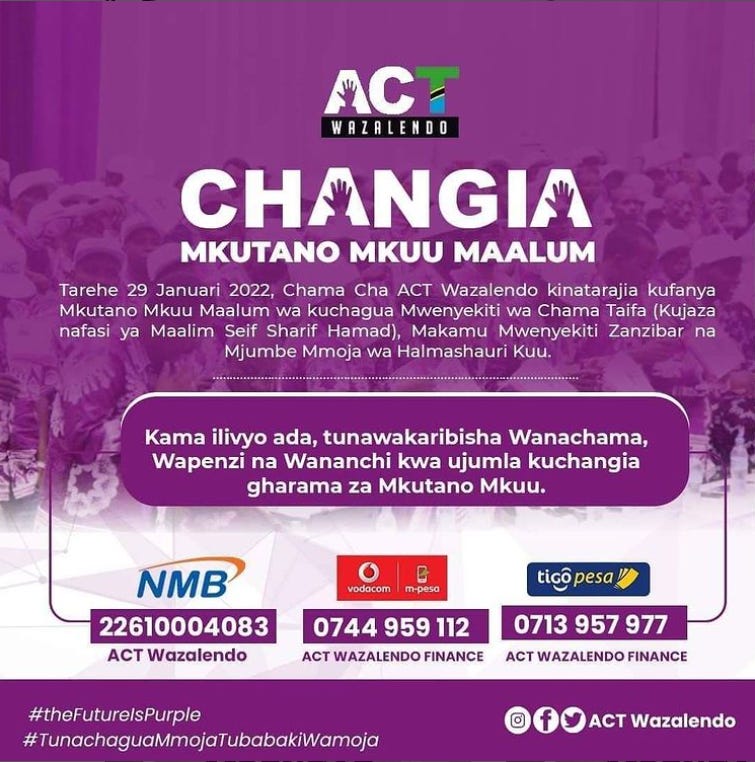ACT-Wazalendo wanafanya mkutano wake mkuu Januari 19, na ukipitia kwenye akaunti zao za mitandao ya kijamii, wamekuwa wakihamasisha wadau mbalimbali kuchangia mkutano huo.