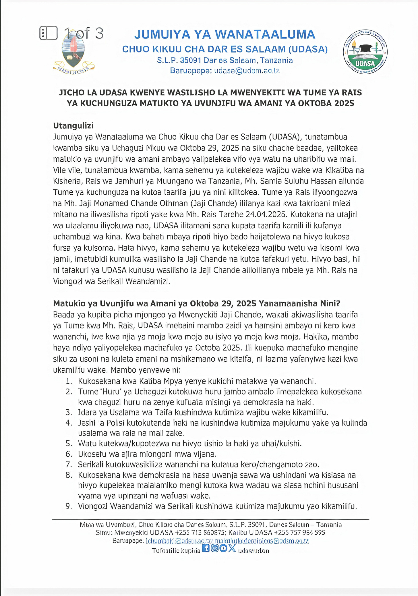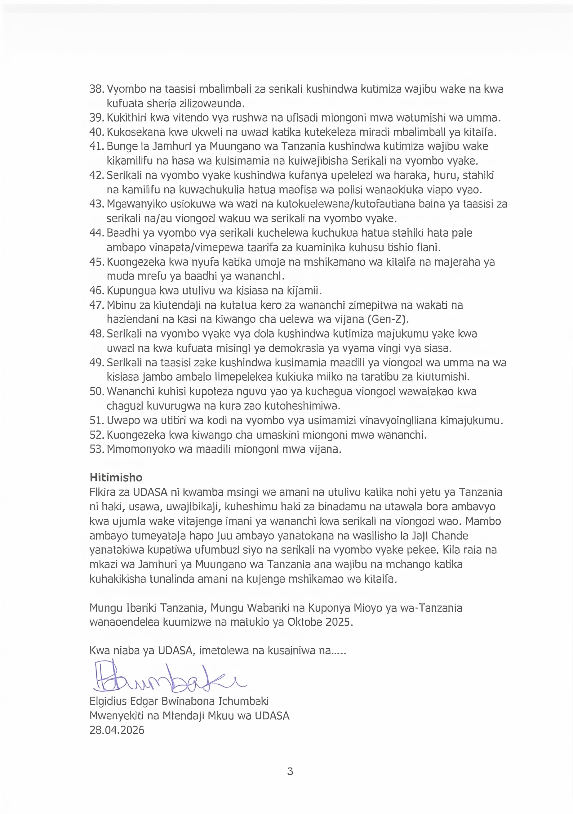 Utangulizi wa waraka huo uko wazi: baada ya kupitia uwasilishaji wa Jaji Chande, UDASA “ilibaini zaidi ya hoja hamsini zinazounda malalamiko ya wananchi, iwe moja, nyingi au hakuna kati yake ndizo zilizoanzisha vurugu za Oktoba 2025.”