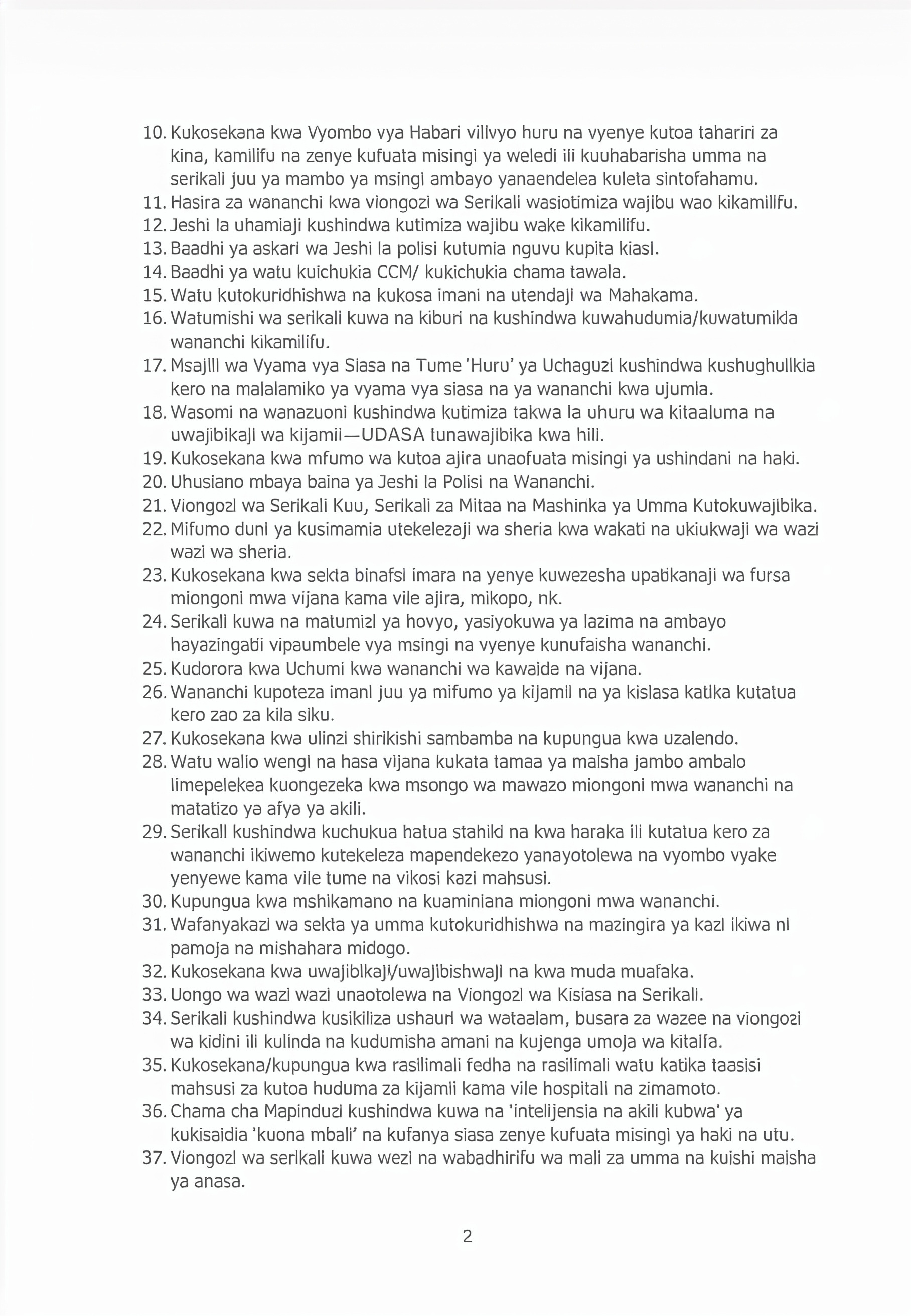 Hoja zinazolenga TISS, polisi, na jeshi ni ukosoaji mkali zaidi wa vyombo hivi tangu mfumo wa vyama vingi uanze 1992. Zinajumuisha: